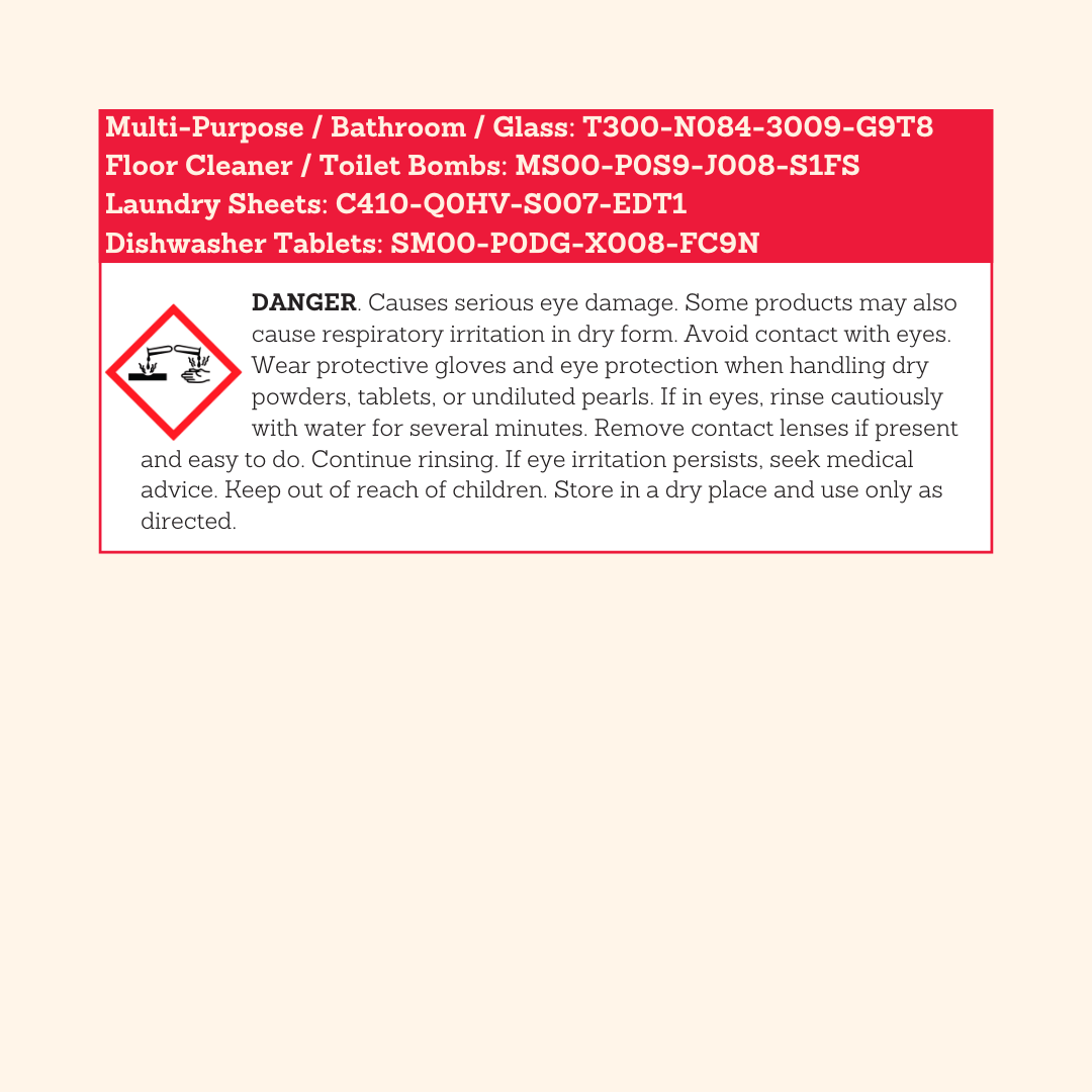 The concentrated powders (in dry form) may cause irritation. Once dissolved in 300ml of tap water, the surface cleaners (Multi-Purpose, Bathroom, Glass, and Floor) are completely hazard-free and will not cause irritation or allergic reactions.