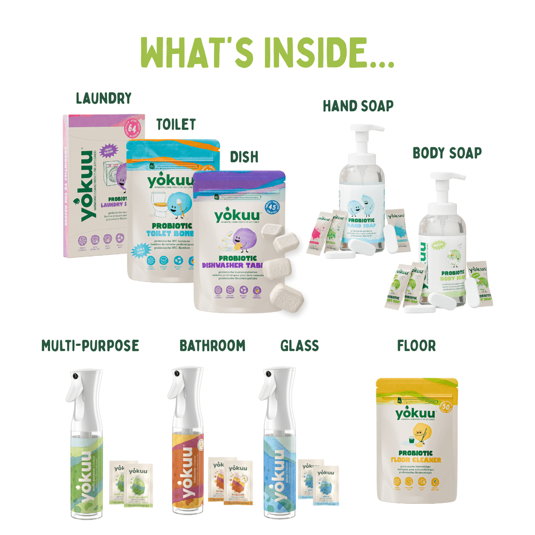 De ultieme YOKUU-bundel bevat al onze hardwerkende producten. Voor je vloer, was, toilet, huid en meer – zonder agressieve chemicaliën of zware flessen.