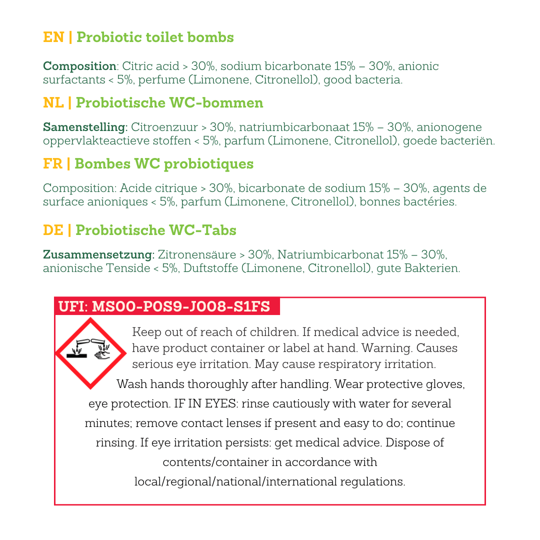 Buiten bereik van kinderen houden! Opgelet: dit is een geconcentreerd product en kan bij foutief gebruik irritatie veroorzaken aan ogen en luchtwegen. Het product is vrij van allergenen. De gebruikte microbiële stammen hebben een QPS-label en zijn voedselveilig.