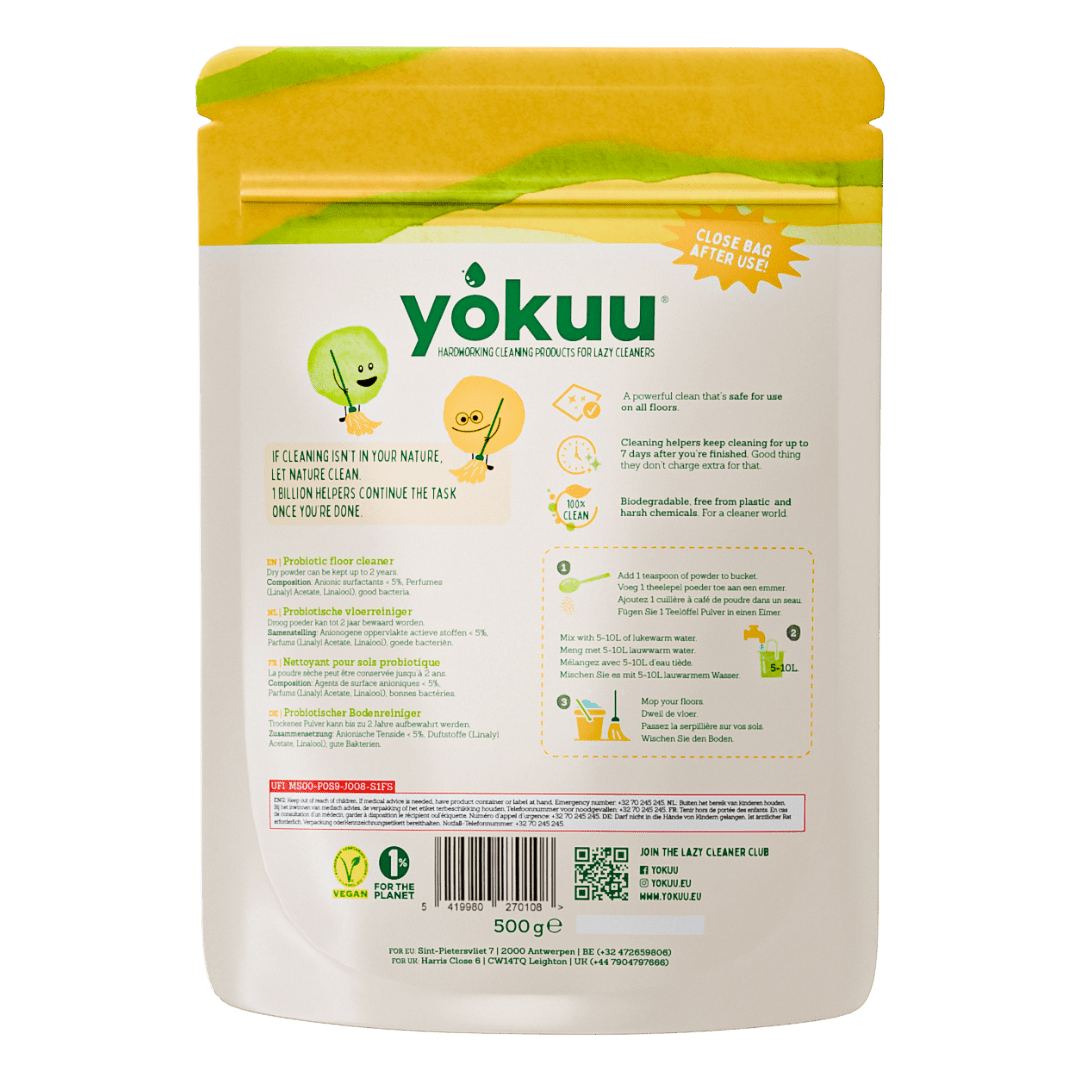 Le nettoyant pour sols probiotique et entièrement naturel de YOKUU garantit des sols sans traces. Il est conçu pour tous les types de sols et combat la poussière, la décoloration et les odeurs. Pour couronner le tout, vous nettoierez mieux et moins souvent. Tout cela grâce à des milliards de bonnes bactéries qui assurent un nettoyage en profondeur jusqu'à 7 jours.