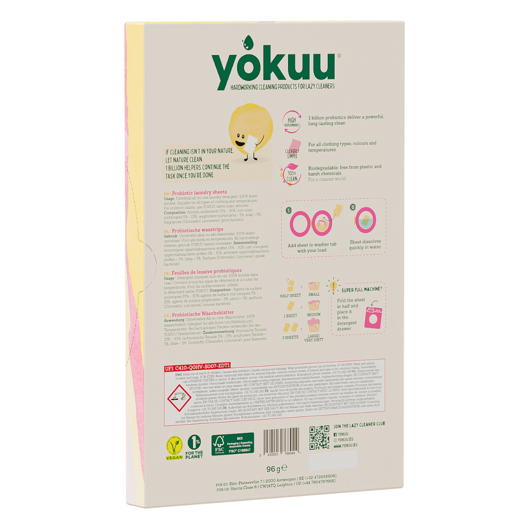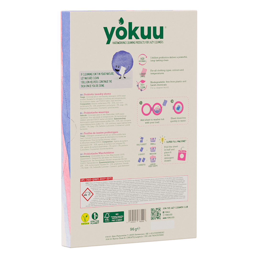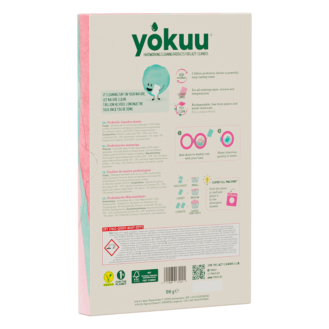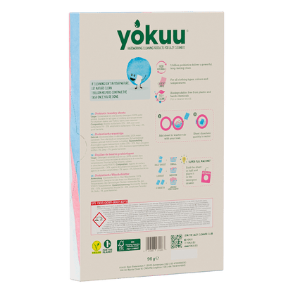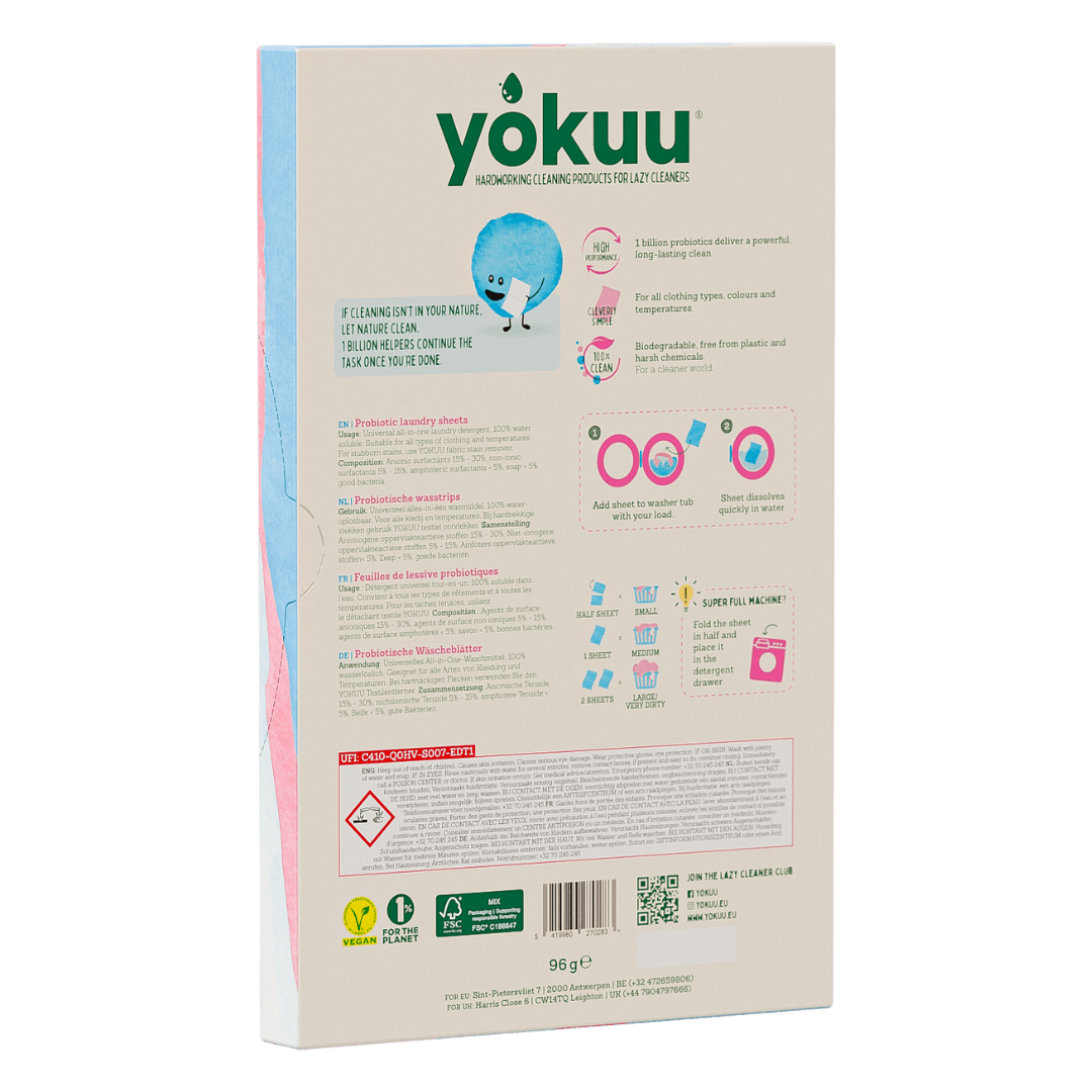 - Chaque pack recyclable contient 32 feuilles de lessive probiotiques (pour réaliser jusqu'à 64 lavages).