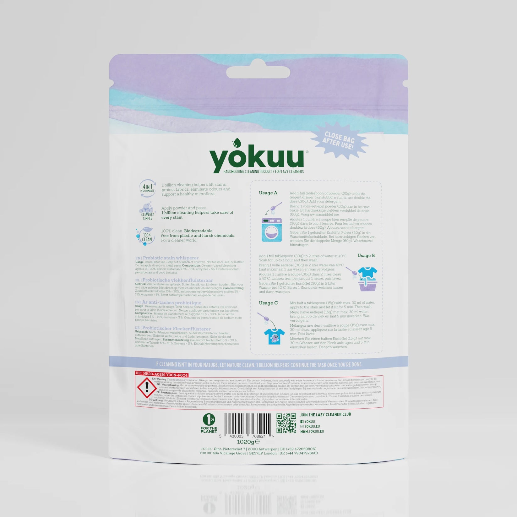 Le Détachant probiotique de YOKUU combine des enzymes et 1 milliard de micro-organismes nettoyants – aussi appelés probiotiques – pour éliminer les taches visibles et les odeurs incrustées. Il agit à basse température, et continue de nettoyer après le cycle. Il favorise une microflore saine dans votre machine et sur vos vêtements.